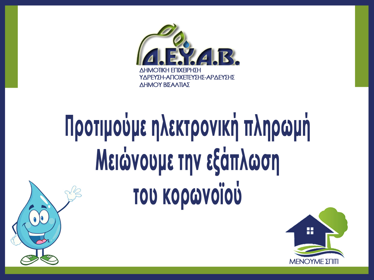 Η Δ.Ε.Υ.Α. Βισαλτίας έχει λάβει όλα τα μέτρα για την προστασία του προσωπικού αλλά και των καταναλωτών της από τον κορωνοϊό. Στην προσπάθεια μας να συμβάλουμε στον περιορισμό της εξάπλωσης του ιού σας παρακαλούμε να προτιμάτε την ηλεκτρονική ή την τηλεφωνική εξυπηρέτησή όσο είναι δυνατό.