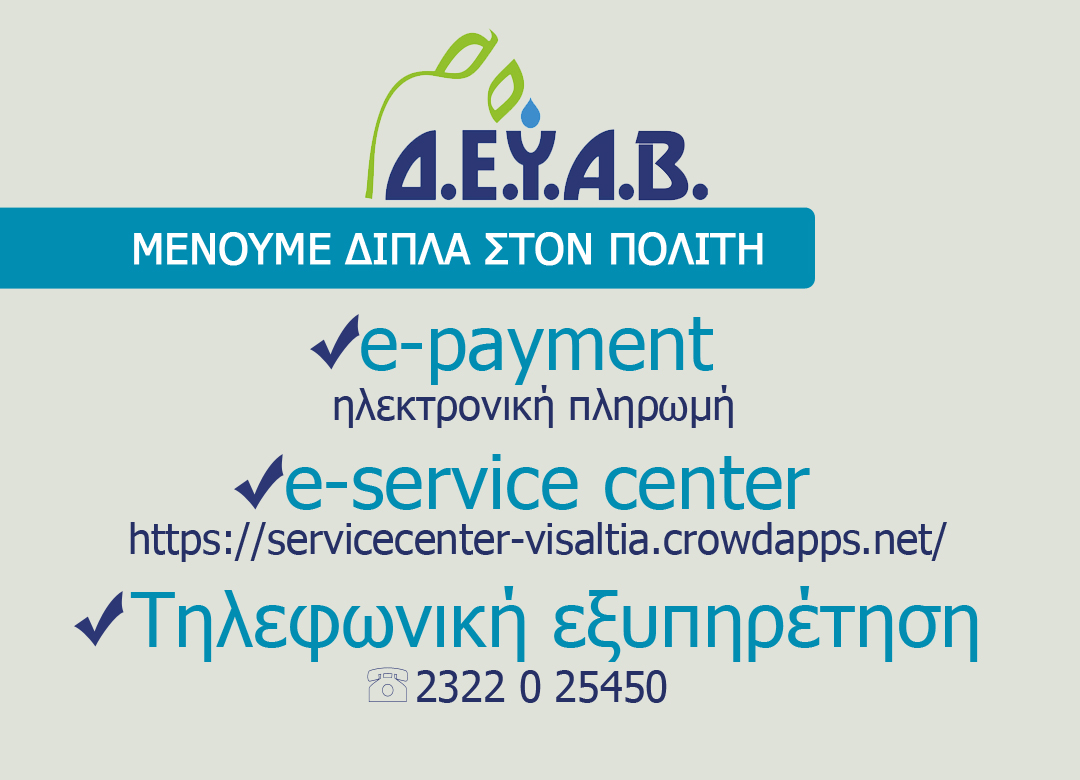 Η Δ.Ε.Υ.Α. Βισαλτίας έχει λάβει όλα τα μέτρα για την προστασία του προσωπικού αλλά και των καταναλωτών της από τον κορονοϊό. Στην προσπάθεια μας να συμβάλουμε στον περιορισμό της εξάπλωσης του ιού σας παρακαλούμε να προτιμάτε την ηλεκτρονική https://servicecenter-visaltia.crowdapps.net/ ή την τηλεφωνική 2322025450 εξυπηρέτησή σας, όσο είναι δυνατό.